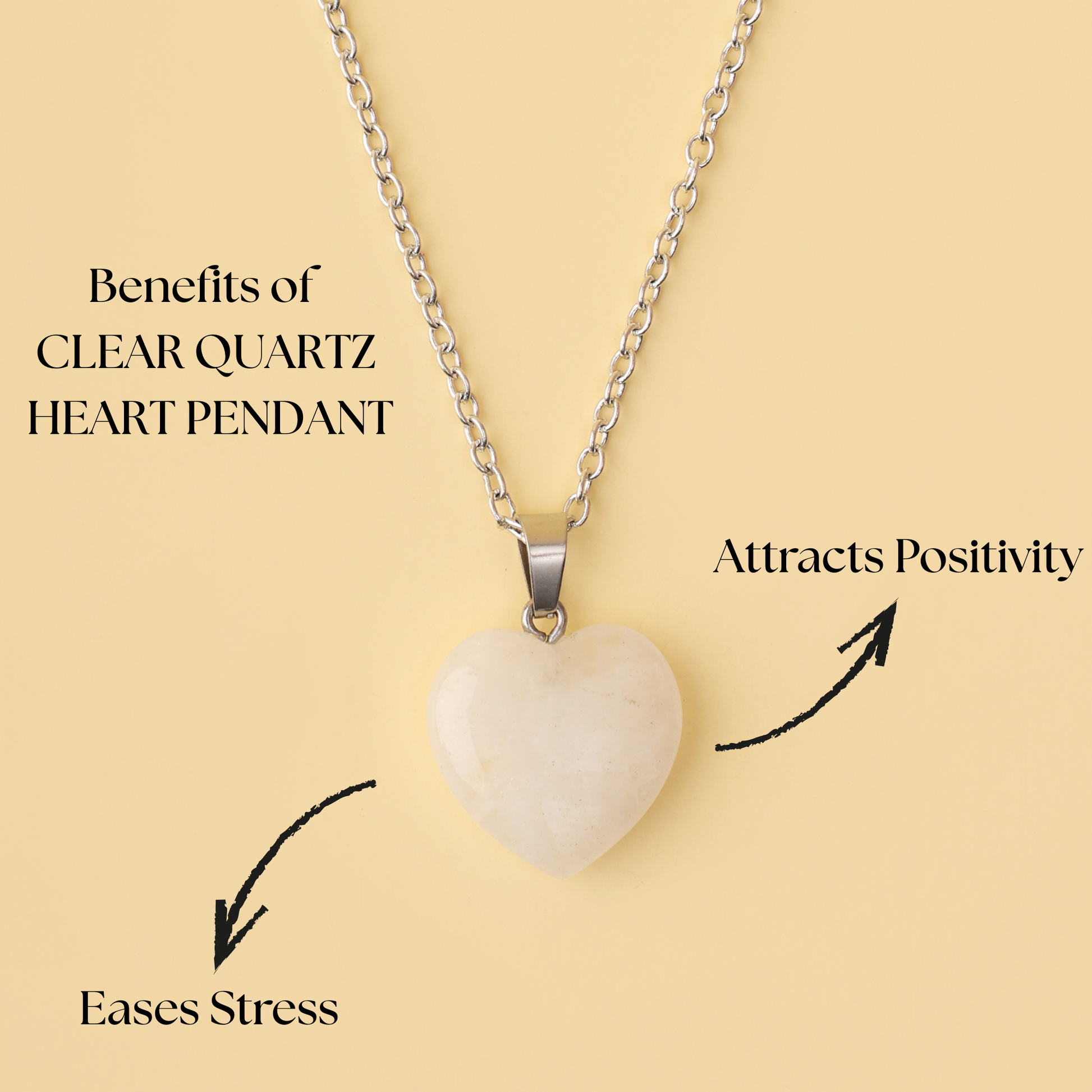 Wearing the Clear Quartz Heart Pendant Necklace is believed to Attract Positivity and Good Vibes, Ease Stress and Anxiety, enhance Confidence and Focus, and promote Clarity of mind while protecting against Negative Energies.