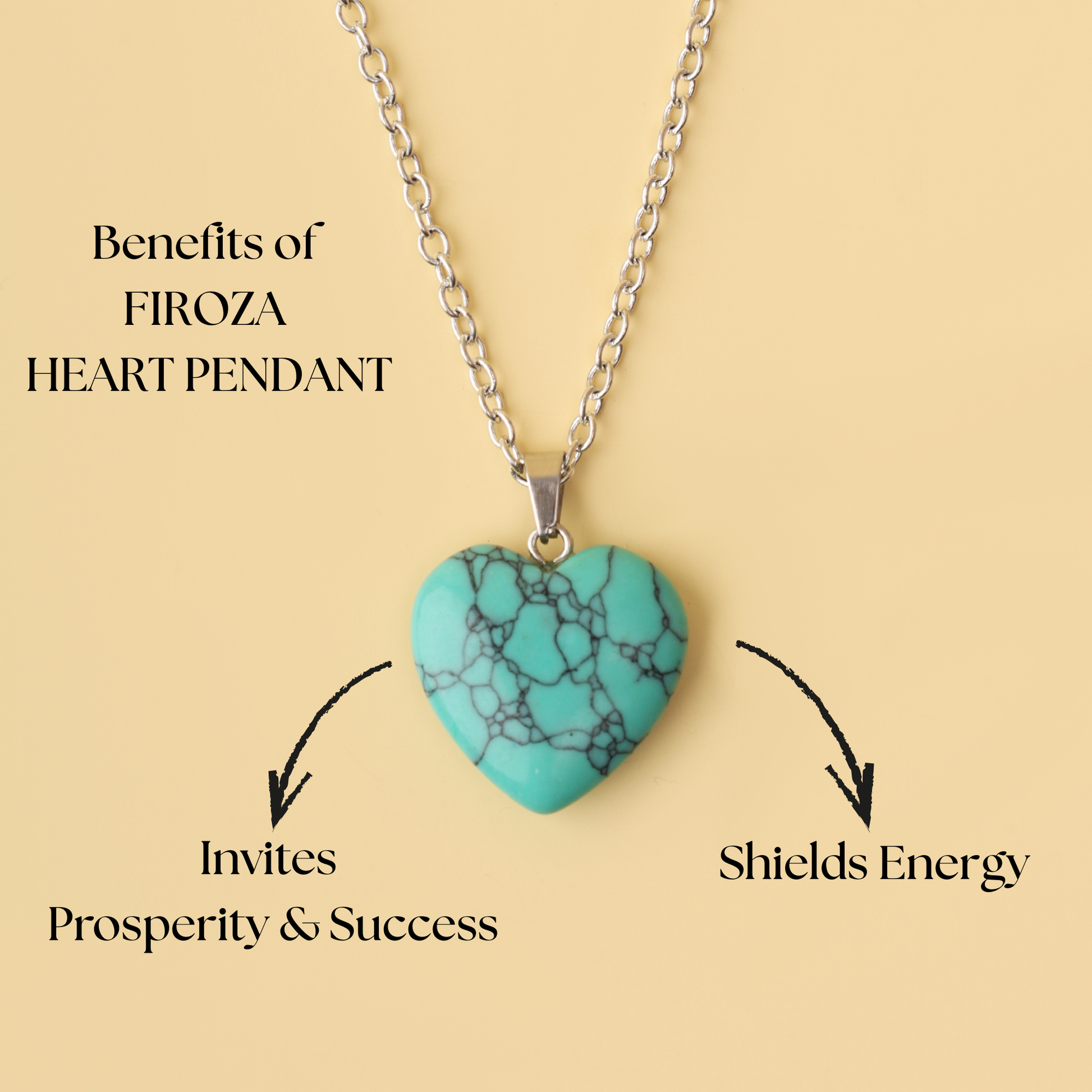 Wearing the Firoza Heart Pendant Necklace is believed to protect against negativity and the evil eye, attract luck and success, promote emotional balance, boost confidence and clarity, and support overall healing and vitality.