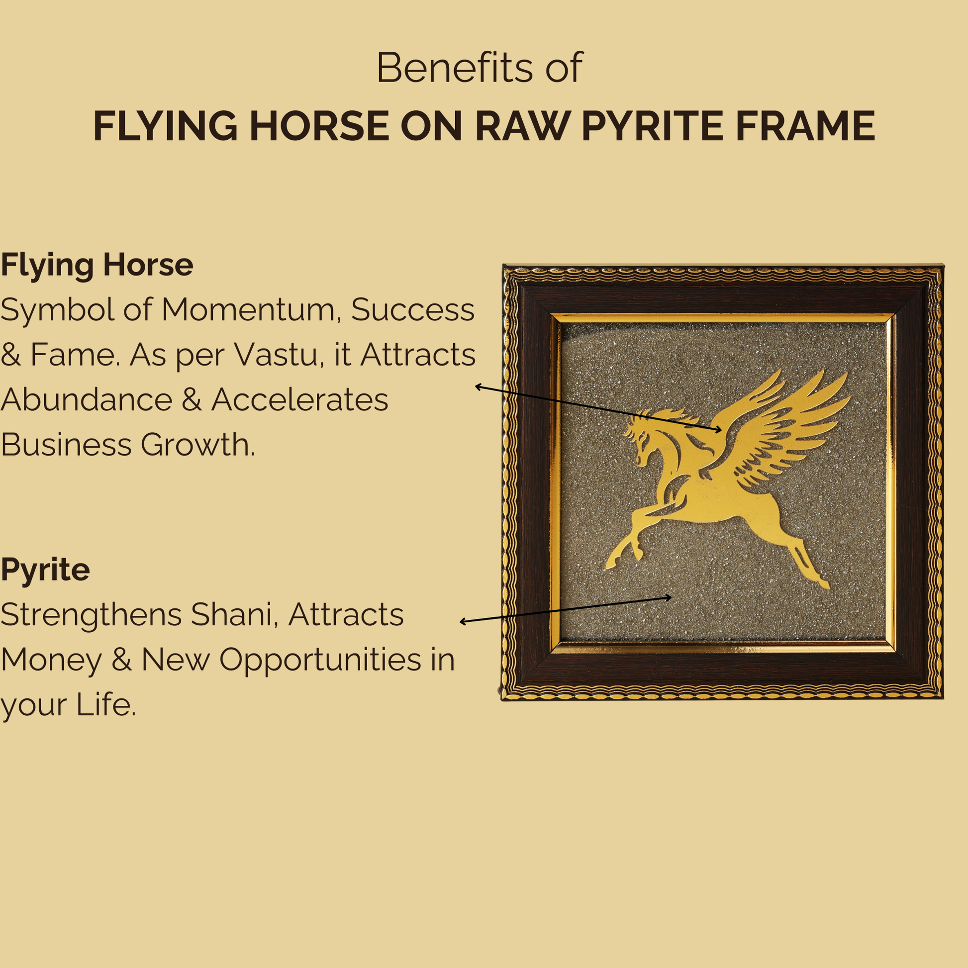According to traditional Vastu beliefs, the placement of the Flying Horse on Raw Pyrite Frame is associated with enhancing balance and positive energy within a space.