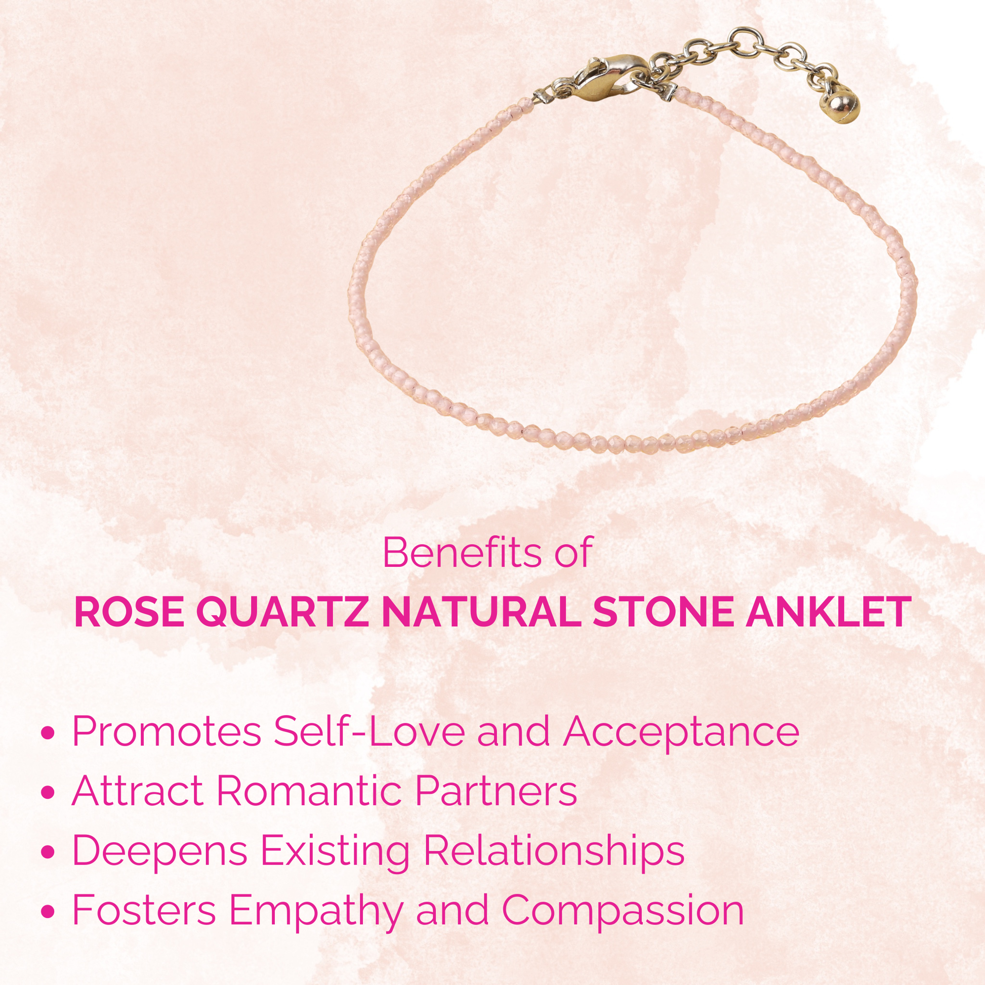 Wearing the Rose Quartz Anklet is believed to nurture Self-Love, Strengthen Relationships, Inspire Compassion, Calm Stress, and Support both Emotional and Physical Healing.